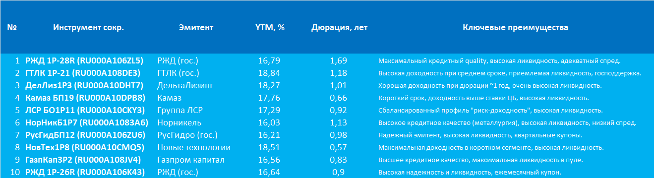 Заключительный комментарий: Представленный список формирует диверсифицированный портфель корпоративных облигаций с фокусом на надежность и умеренный риск. В условиях высокой ключевой ставки (16%) предпочтение отдаётся кратко- и среднесрочным бумагам (до 2 лет) с доходностью к погашению 17-19%, что обеспечивает положительную реальную доходность при контролируемой дюрации. Длинные бумаги (ГТЛК 1P-20) имеют спекулятивную характеристику для инвесторов, уверенных в скором начале цикла снижения ставок ЦБ РФ.