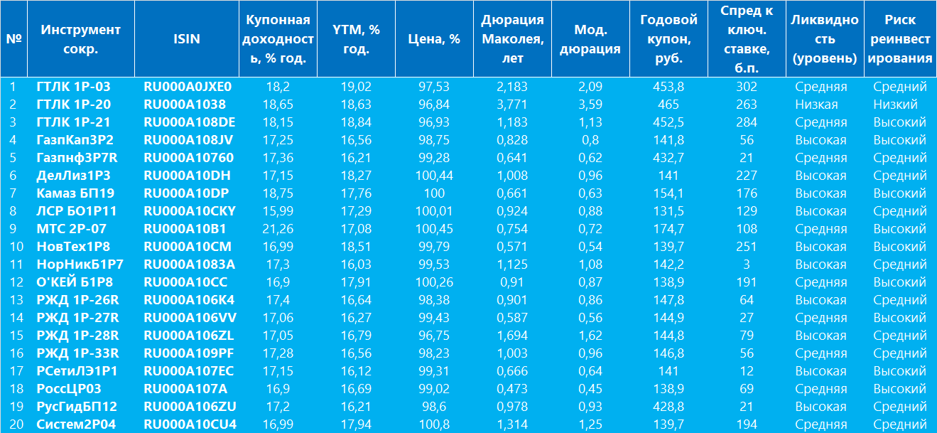 ЛСР БО1Р11 (RU000A10CKY3): YTM 17.29%, высокая ликвидность, дюрация 0.92 года.
