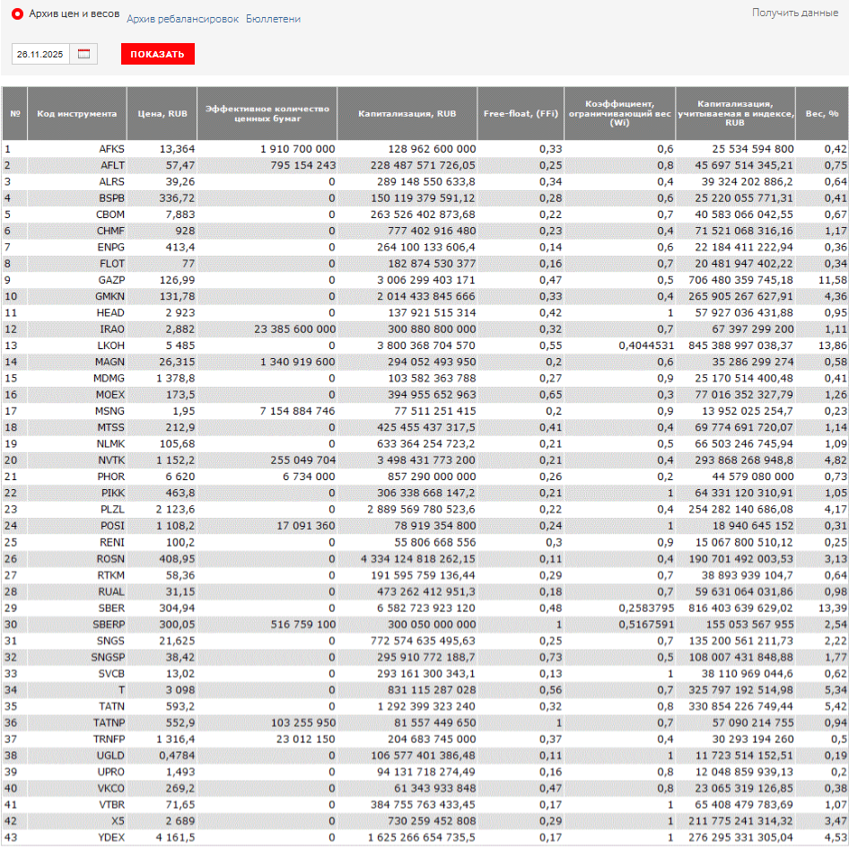 1. Получение актуального состава и весов. Московская биржа раскрывает полный список бумаг и их весовые коэффициенты на своем сайте. Данные обновляются после каждой квартальной ребалансировки.