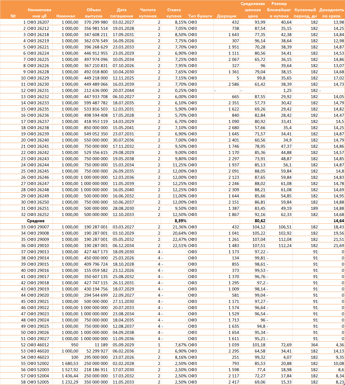Бросается в глаза, что для большинства "обычных" ОФЗ (серии 262xx) доходность к погашению 14,64% существенно выше средней ставки купона (8,39%).