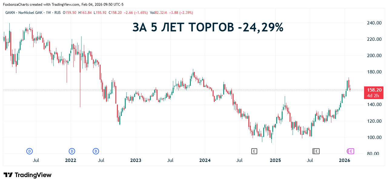 Анализ динамики акций GMKN на основе представленных графиков показывает сложную картину. В краткосрочной динамике акции демонстрируют снижение, вызванное геополитическими факторами. Однако на месячном таймфрейме наблюдается восходящий тренд с ростом более чем на 33% за год, что указывает на позитивное восприятие компании рынком в среднесроке. При этом на пятилетнем периоде акции находятся в долгосрочном нисходящем треке с падением около -24%. Волатильность торгов можно оценить как умеренную.
