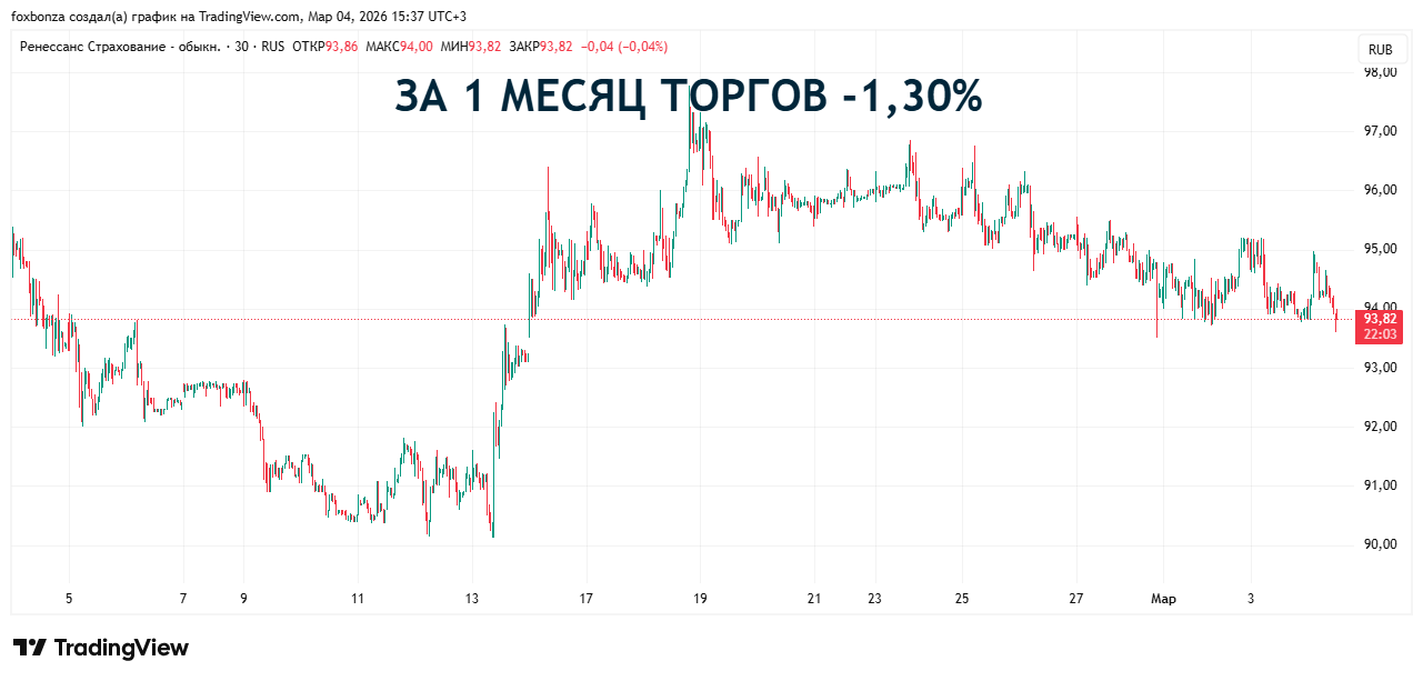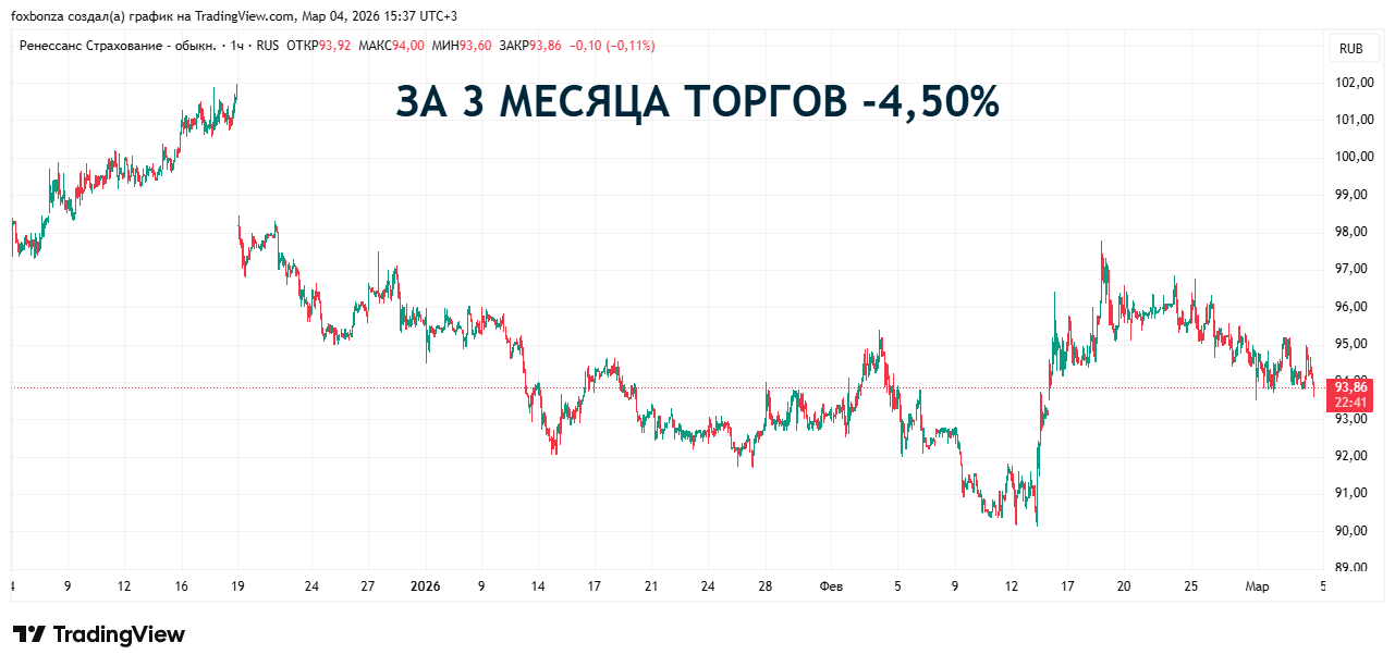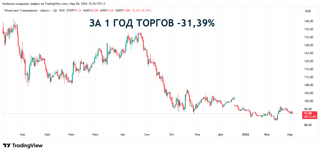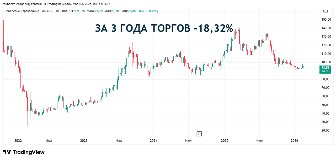 ПАО «Группа Ренессанс Страхование» — российский страховщик. Причём, универсальный страховщик с большим опытом (более 28 лет на рынке). Это не просто контора по продаже полисов ОСАГО, а целая группа, включающая в себя страхование жизни («Ренессанс Жизнь»), управление активами и даже маркетплейс медицинских услуг . Компания входит в число системообразующих страховых организаций России . Количество выпущенных акций: 556 952 780 штук. При текущей цене 94 рубля за акцию, капитализация компании составляет около 52,35 млрд рублей.