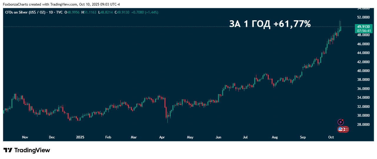 По состоянию на 16:28 по московскому времени серебро торгуется с повышением на 3,71%, по $50,669 за унцию.