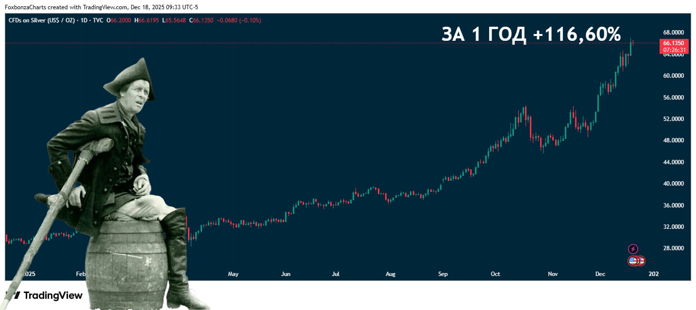 На фоне снижения процентных ставок и экономической неопределенности серебро и золото продолжают расти в цене. Спотовая цена серебра на торгах в среду составила $65,91 за унцию, что на 3,3% выше по сравнению с предыдущей сессией. С начала текущего года серебро подорожало на 128%, золото — на 65%.
