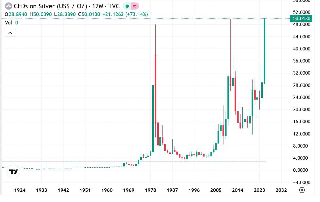 Цена на серебро достигла рекорда за десятилетия — более 50 долл. за унцию.