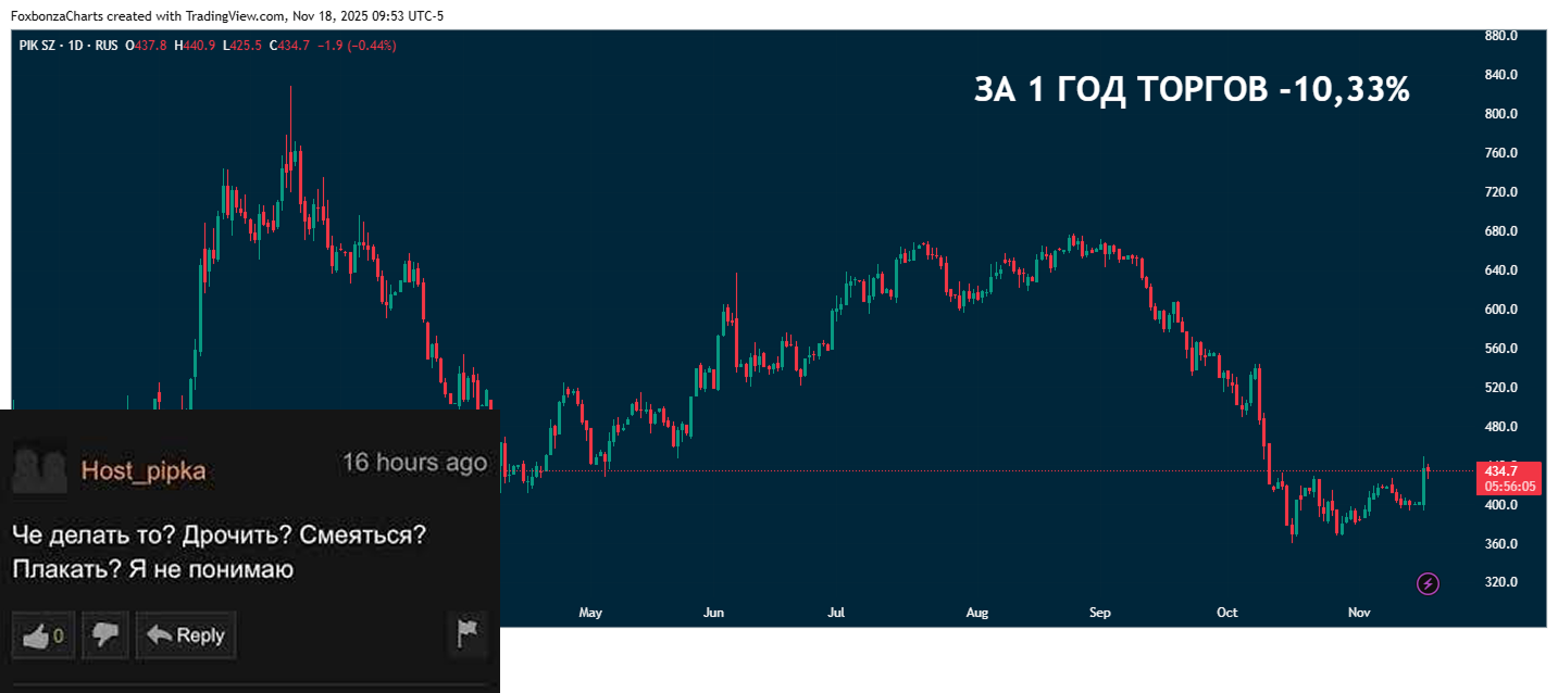 В начале октября совет директоров "ПИКа" рекомендовал провести обратный сплит акций в соотношении 100 к 1, а также отменил действовавшую с 2023 года дивидендную политику. Сейчас цена акций девелопера - порядка 400-500 рублей за штуку, консолидация могла бы сделать акции "ПИКа" самыми дорогими среди ликвидных бумаг на российском фондовом рынке - порядка 40-50 тысяч рублей. Рынок с самого начала посчитал идею обратного сплита спорной: с того момента, как компания ее озвучила, котировки упали на 26%.
