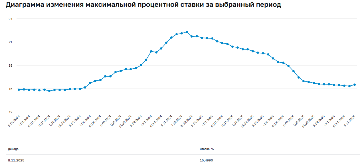 Средняя максимальная ставка по вкладам крупнейших российских банков во второй декаде ноября 2025 года обновила годовой рекорд, достигнув 15,5%, впервые с начала года.