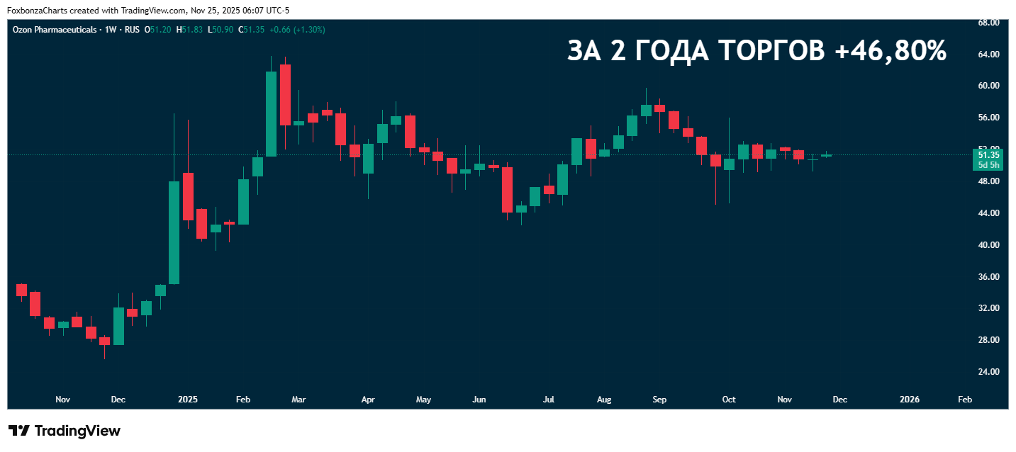 В октябре 2024 года "Озон Фармацевтика" провела IPO на Мосбирже объемом 3,45 млрд рублей, а в июне этого года в ходе SPO привлекла 2,8 млрд рублей, доля акций компании в свободном обращении увеличилась с 10% до 14%.
