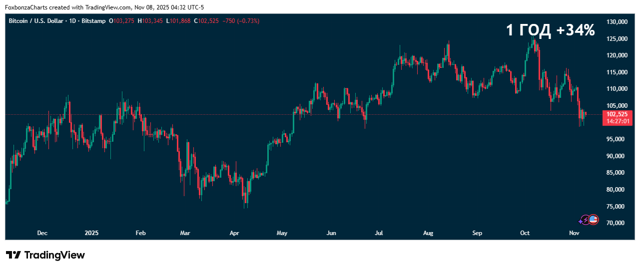 С крипторынка за день 4 ноября 2025г. было выведено 250 млрд долл. Цена падала до $99K. Сейчас торгуется более $102K. Такие колебания играют злую шутку с криптовалютой, как со средством, которое кто-то рассматривает в качестве "инвестиции".