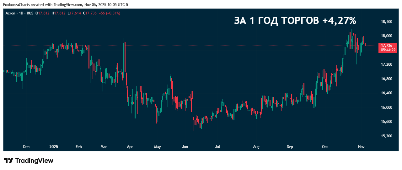 Совет директоров компании «Акрон» рекомендовал акционерам выплатить дивиденды по итогам девяти месяцев 2025 года в размере 189 рублей на акцию. Дата закрытия реестра акционеров установлена на 9 декабря, собрание акционеров пройдет 28 ноября. Дивидендная доходность 1,65%.