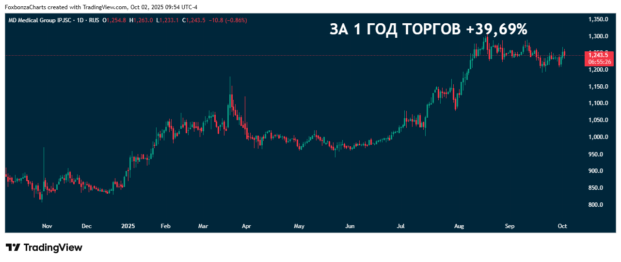 Совет директоров МКПАО «МД Медикал Груп Инвестментс» утвердил выплату дивидендов за первое полугодие 2025 года в размере 42 рубля на акцию. Дивидендная доходность 3,38%.