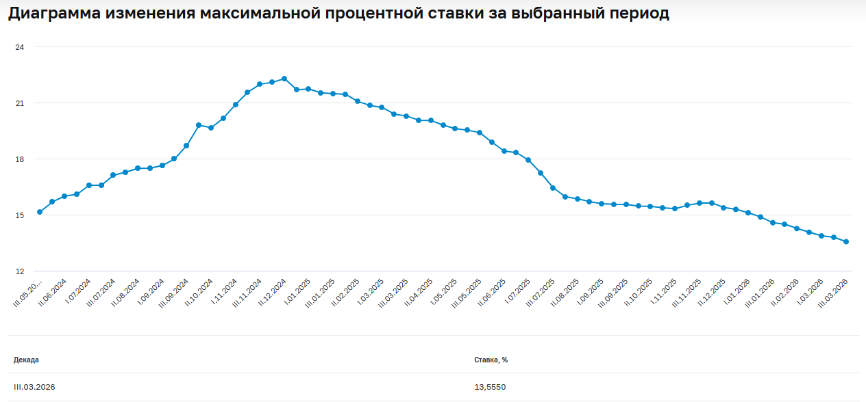Средняя максимальная процентная ставка по вкладам топ-10 российских банков в третьей декаде марта 2026 года снизилась до 13,56% с 13,80% во второй декаде. По данным Центрального банка РФ, данный показатель достиг минимального значения с октября 2023 года, когда он составлял 12,04%.
