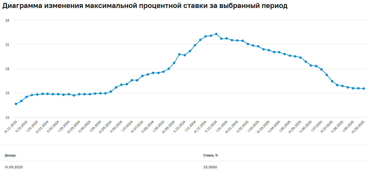 Средние максимальные ставки, рассчитанные Центробанком, упали незначительно — до 15,55% с 15,56% во второй декаде сентября.