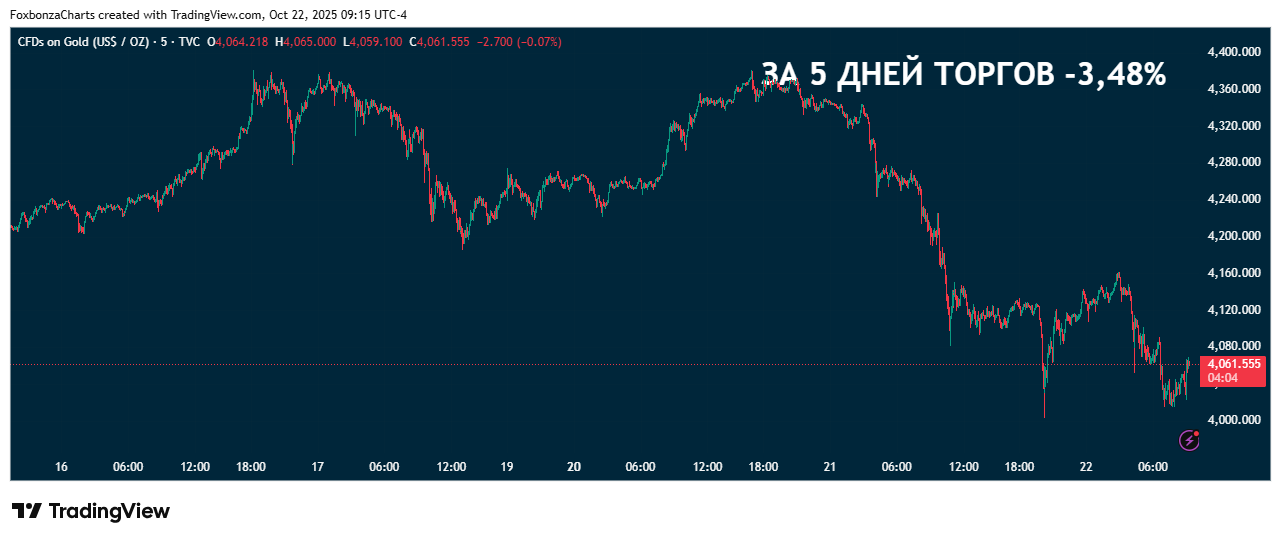 По данным на 19:43 по московскому времени, цена на драгметалл составляет $4113,99 за унцию, что на 5,6% ниже, чем на закрытие предыдущей сессии. Ранее в ходе торгов она опускалась на максимальные с 2013 года 6,3%, до $4082,03 за унцию.
