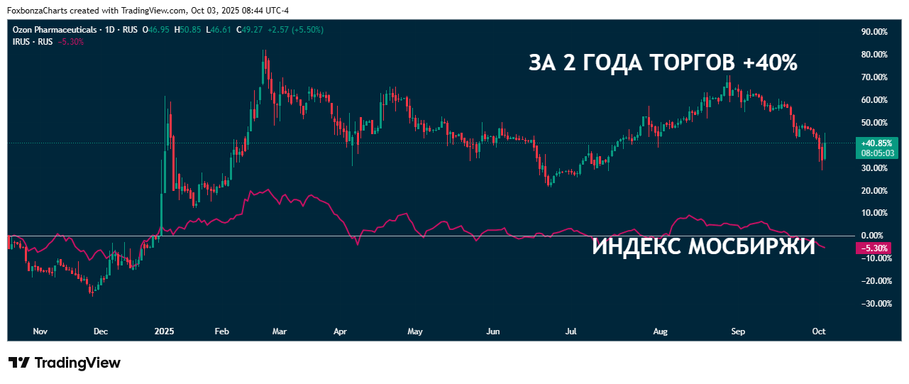 В пятницу акции ПАО «Озон Фармацевтика» на Мосбирже выросли на 8,9%, достигнув отметки 50,85 рубля за акцию. Отсечка дивидендов запланирована на 6 октября 2025 года.